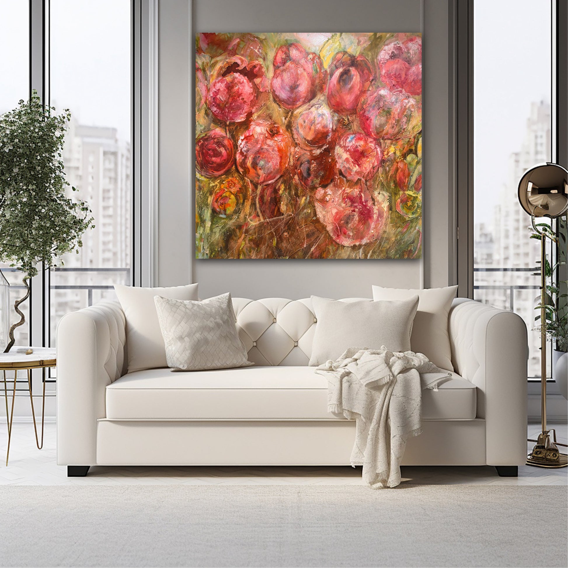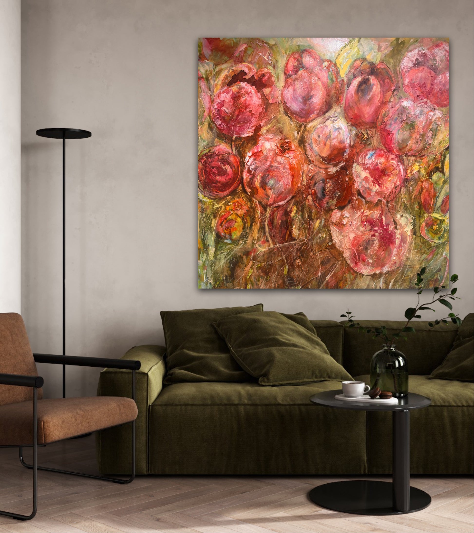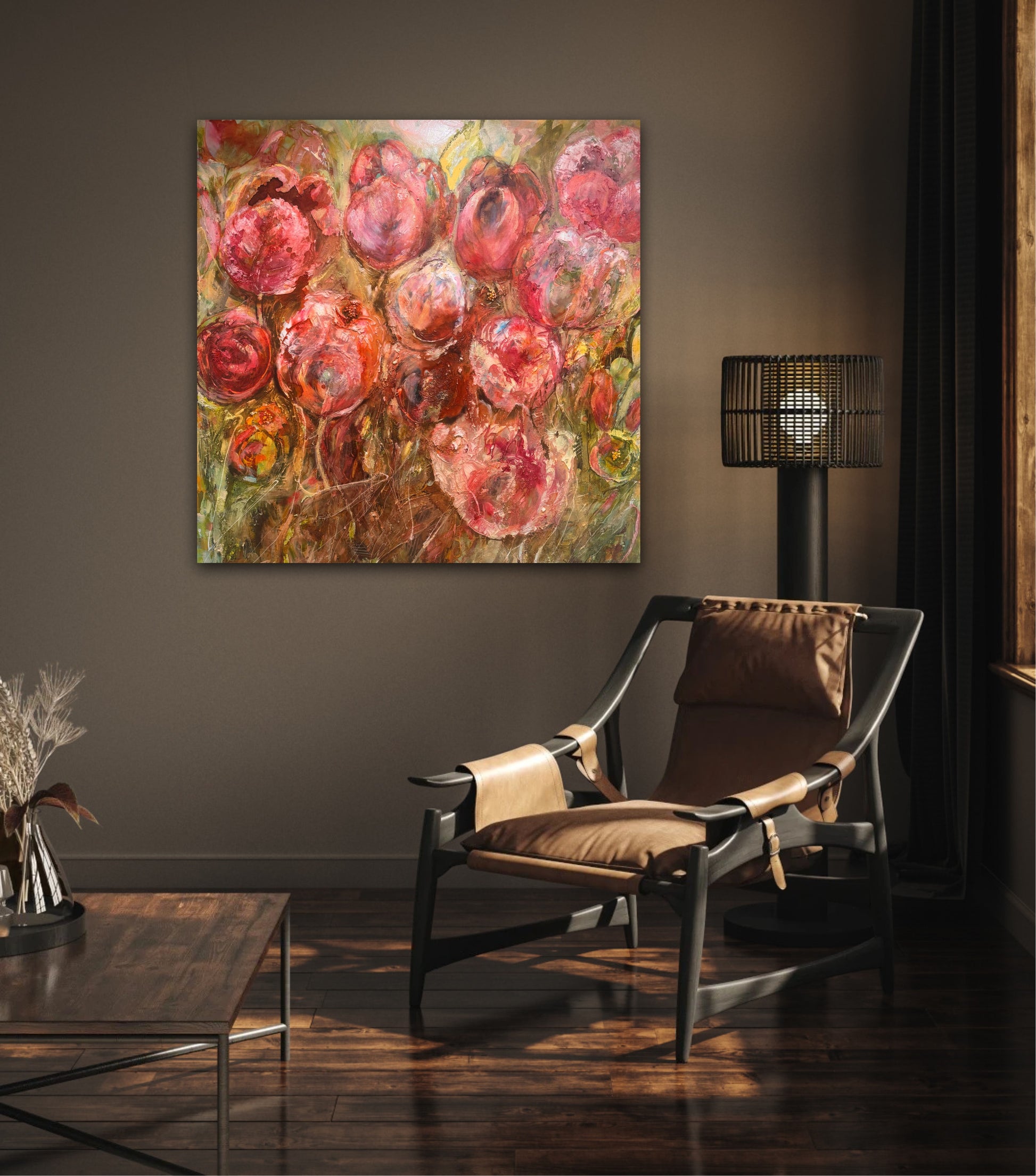 Det här är en kraftfull och färgstark målning i rosa och rosaröda toner, där man kan skönja tulpaner – eller kanske bara blomning, liv och rörelse. Motivet är målat mer åt det abstrakta hållet, vilket gör att tavlan får en fri och modern känsla, samtidigt som blommorna ändå finns där som en mjuk igenkänning.