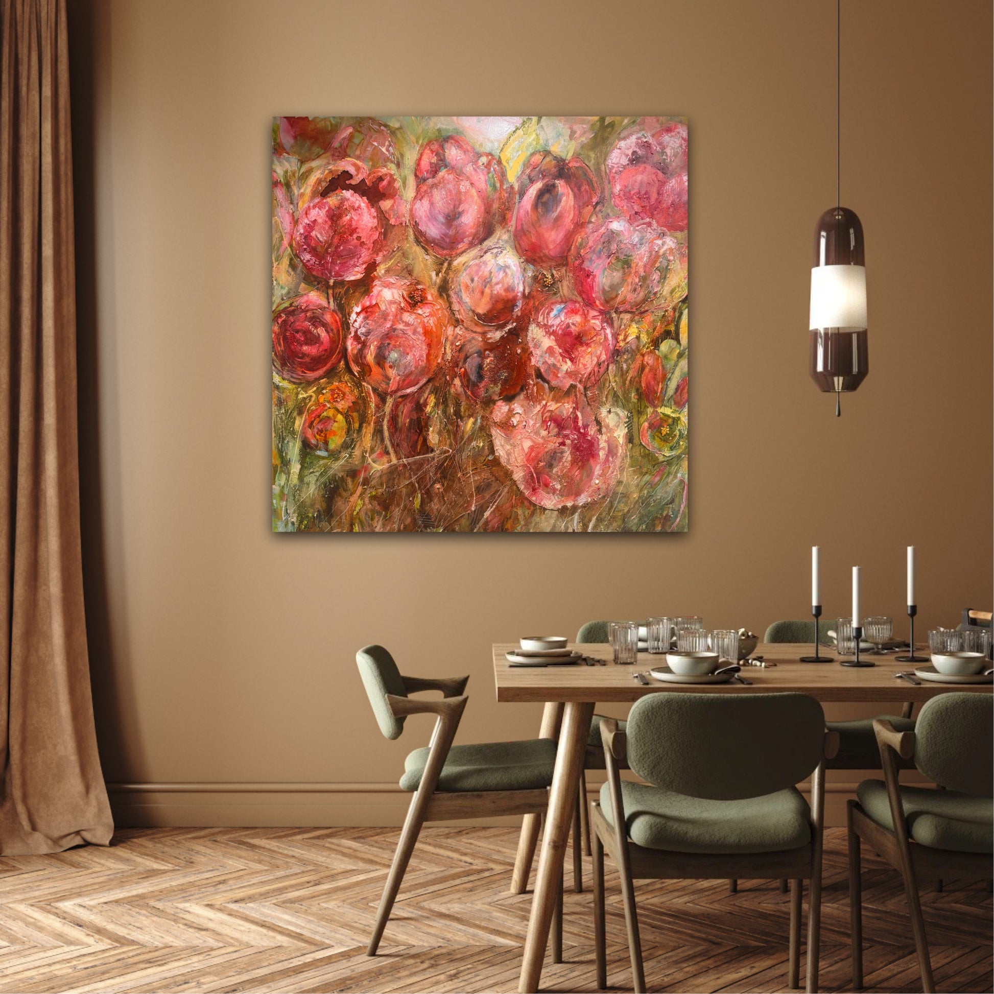 De gröna tonerna i bakgrunden möter det röda på ett sätt som får färgerna att lyfta varandra. Kontrasten skapar energi, djup och ett uttryck som verkligen syns – en tavla som tar plats på bästa sätt.