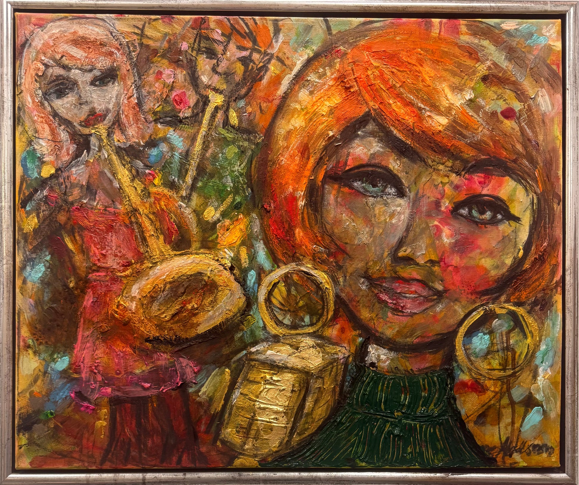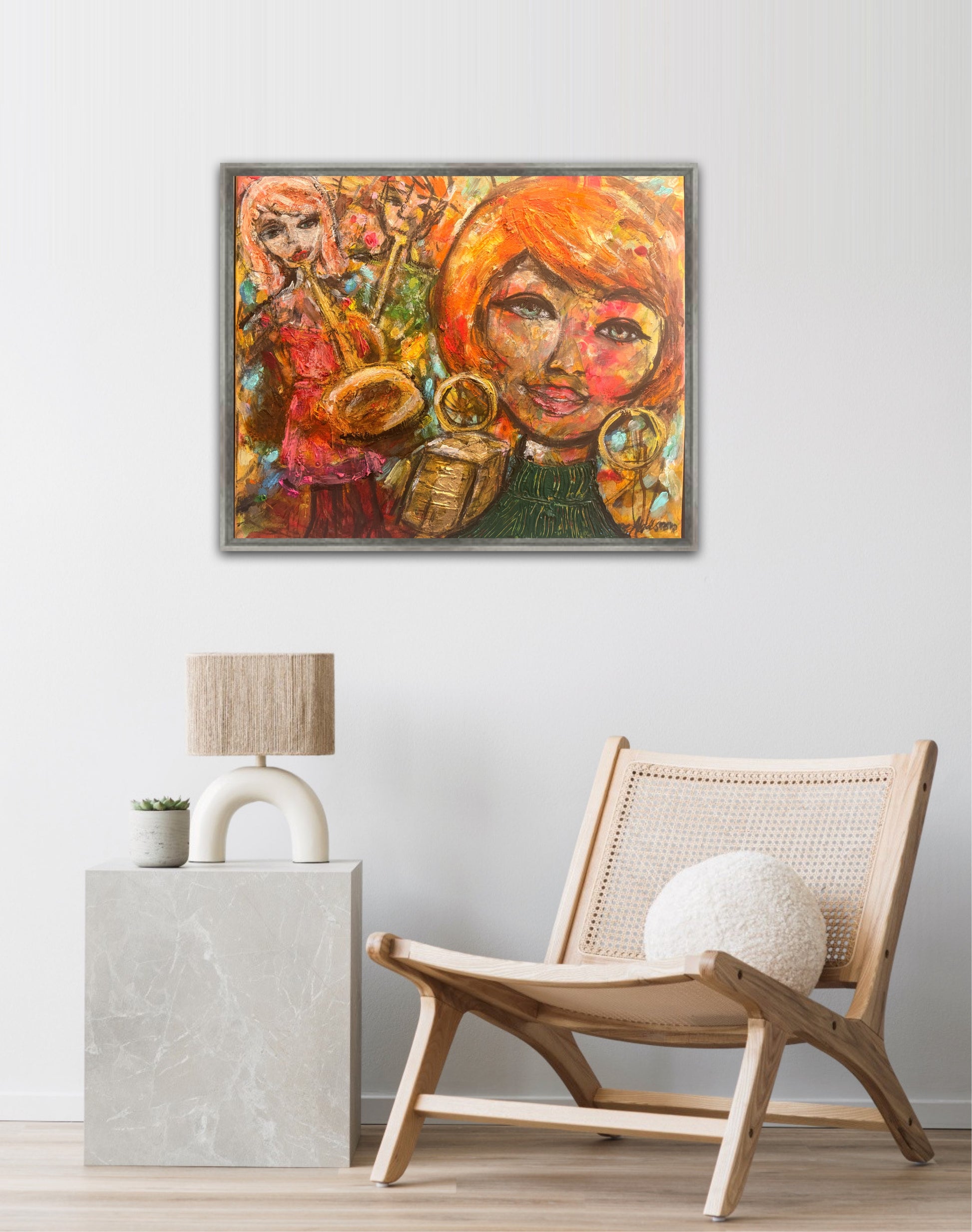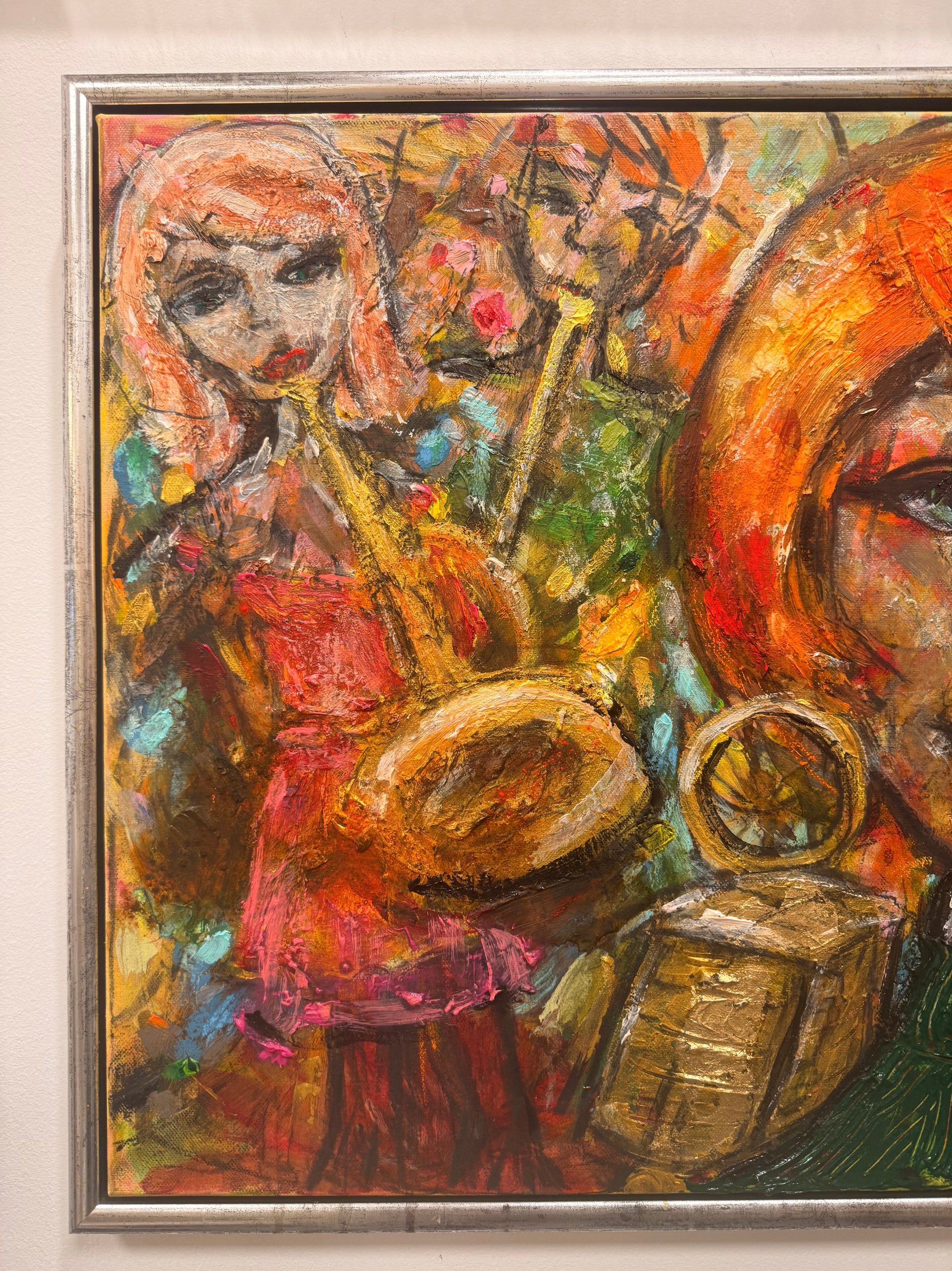 Verket är målat i en naivistisk och expressiv stil där färg, struktur och spontana penseldrag bygger upp en levande bildvärld. De varma tonerna i orange, rött och guld möter djupare nyanser och skapar en målning fylld av både rytm och rörelse.