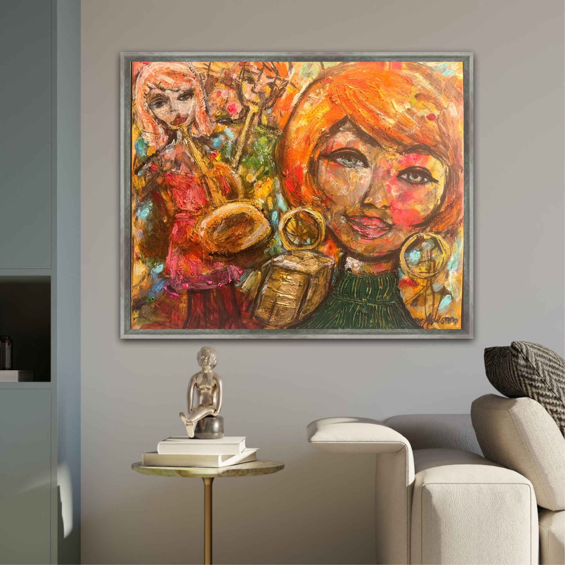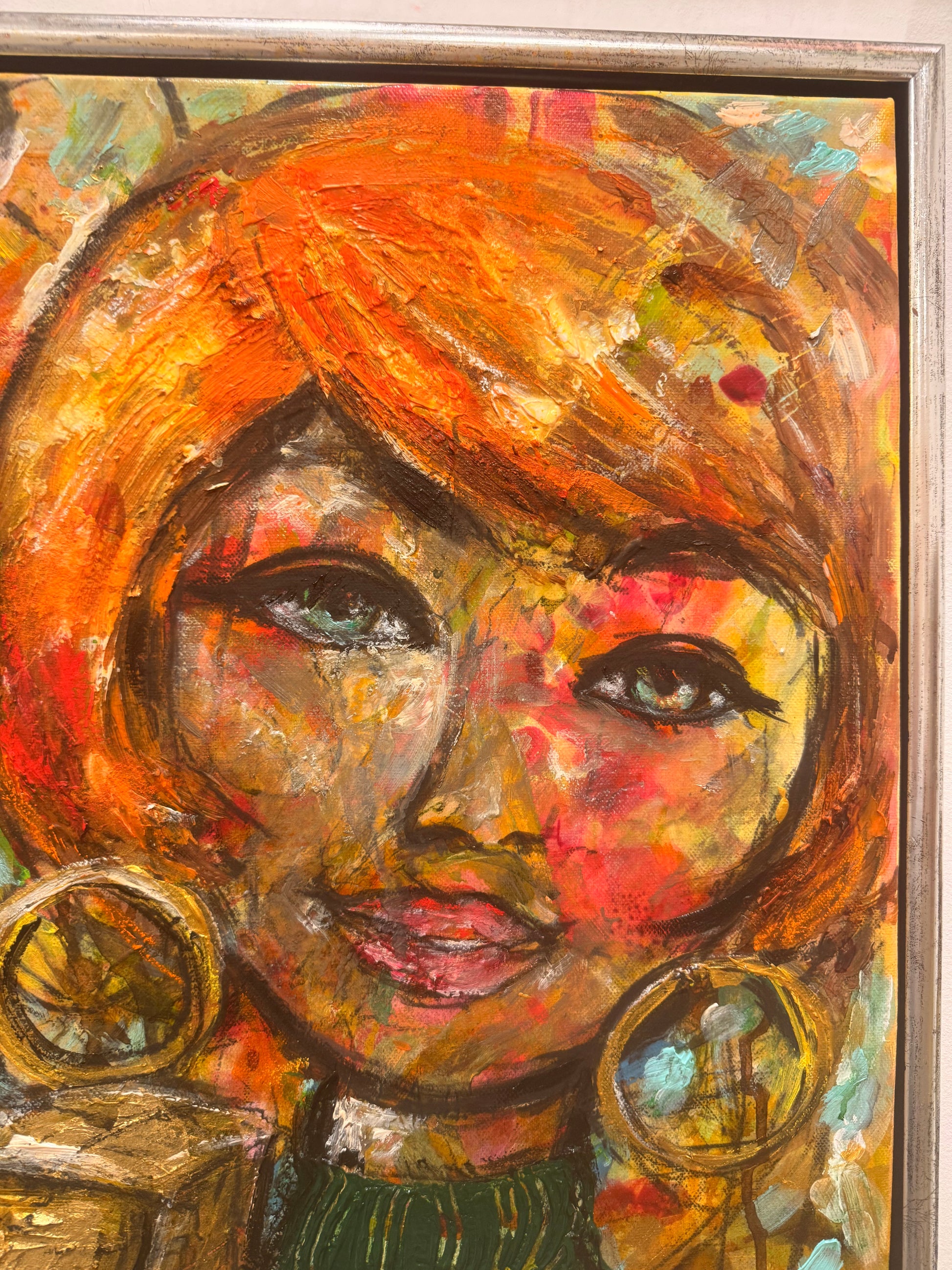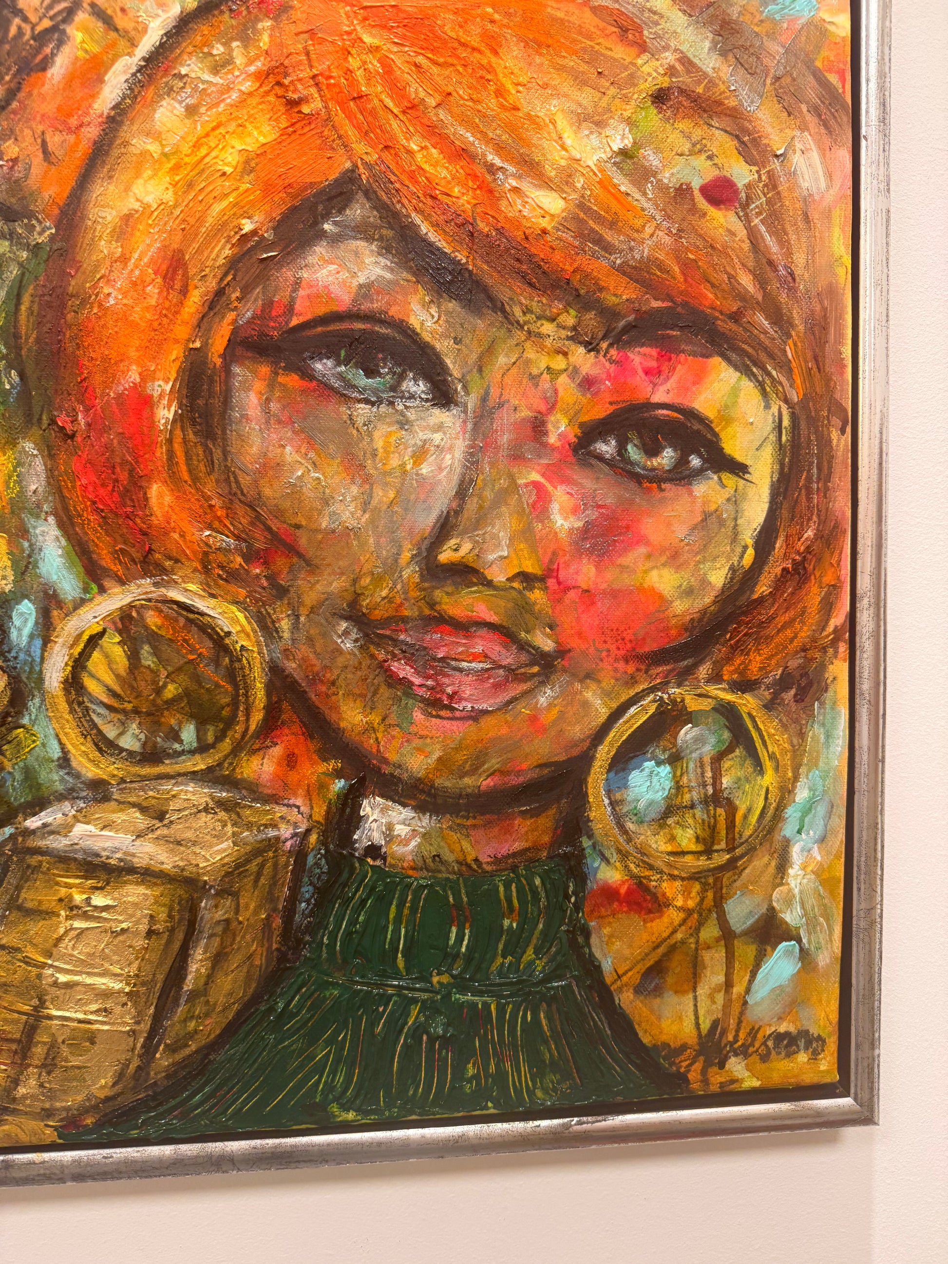 Verket är målat i en naivistisk och expressiv stil där färg, struktur och spontana penseldrag bygger upp en levande bildvärld. De varma tonerna i orange, rött och guld möter djupare nyanser och skapar en målning fylld av både rytm och rörelse.