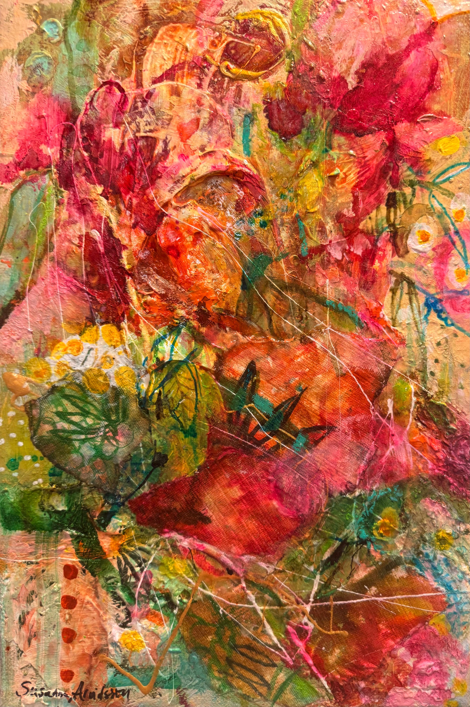 De intensiva rosa, röda och varma tonerna balanseras av gröna och jordnära nyanser, vilket gör att tavlan både tar plats och smälter in. Den passar fint i rum där du vill tillföra energi, kreativitet och en personlig touch.
