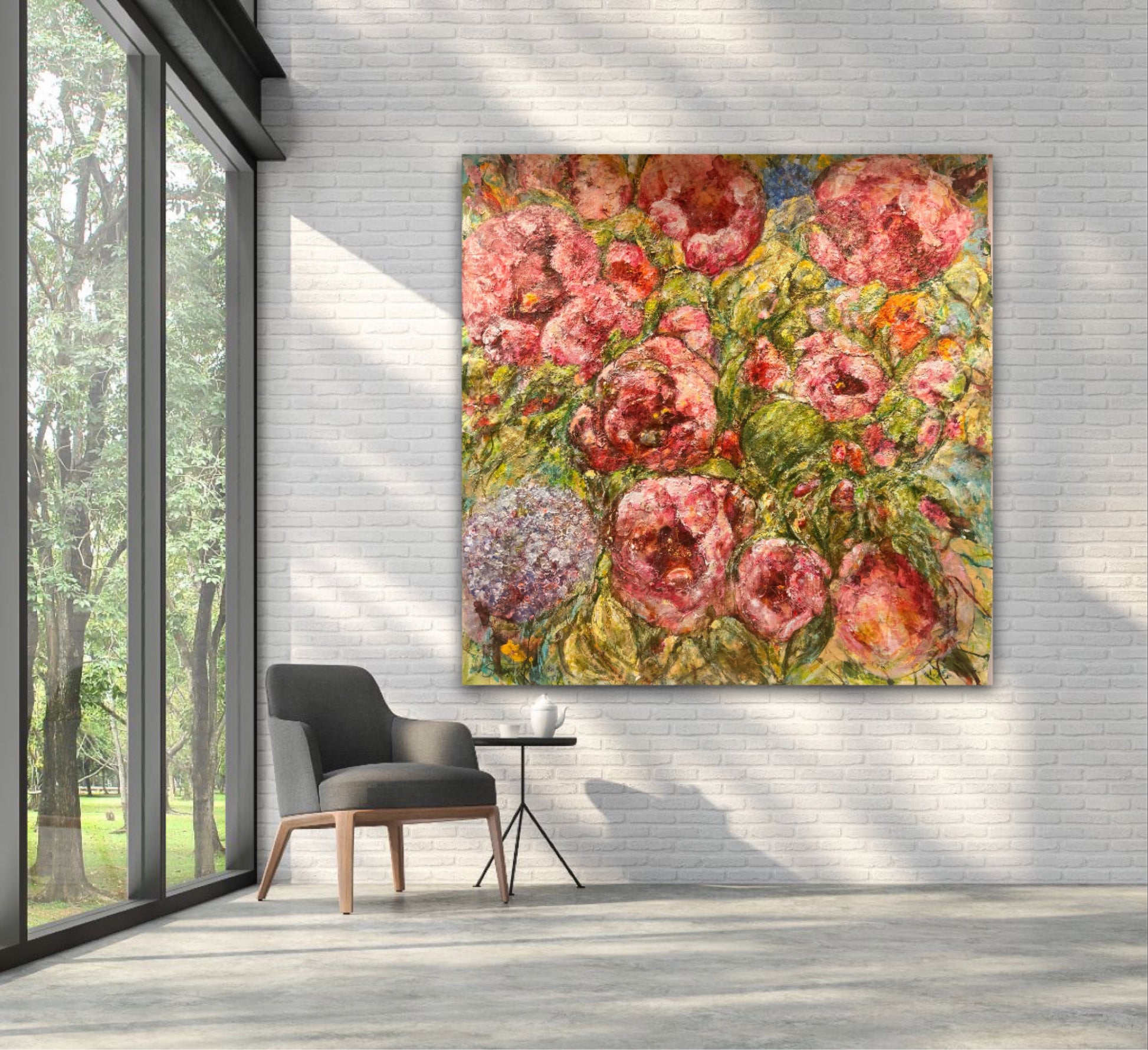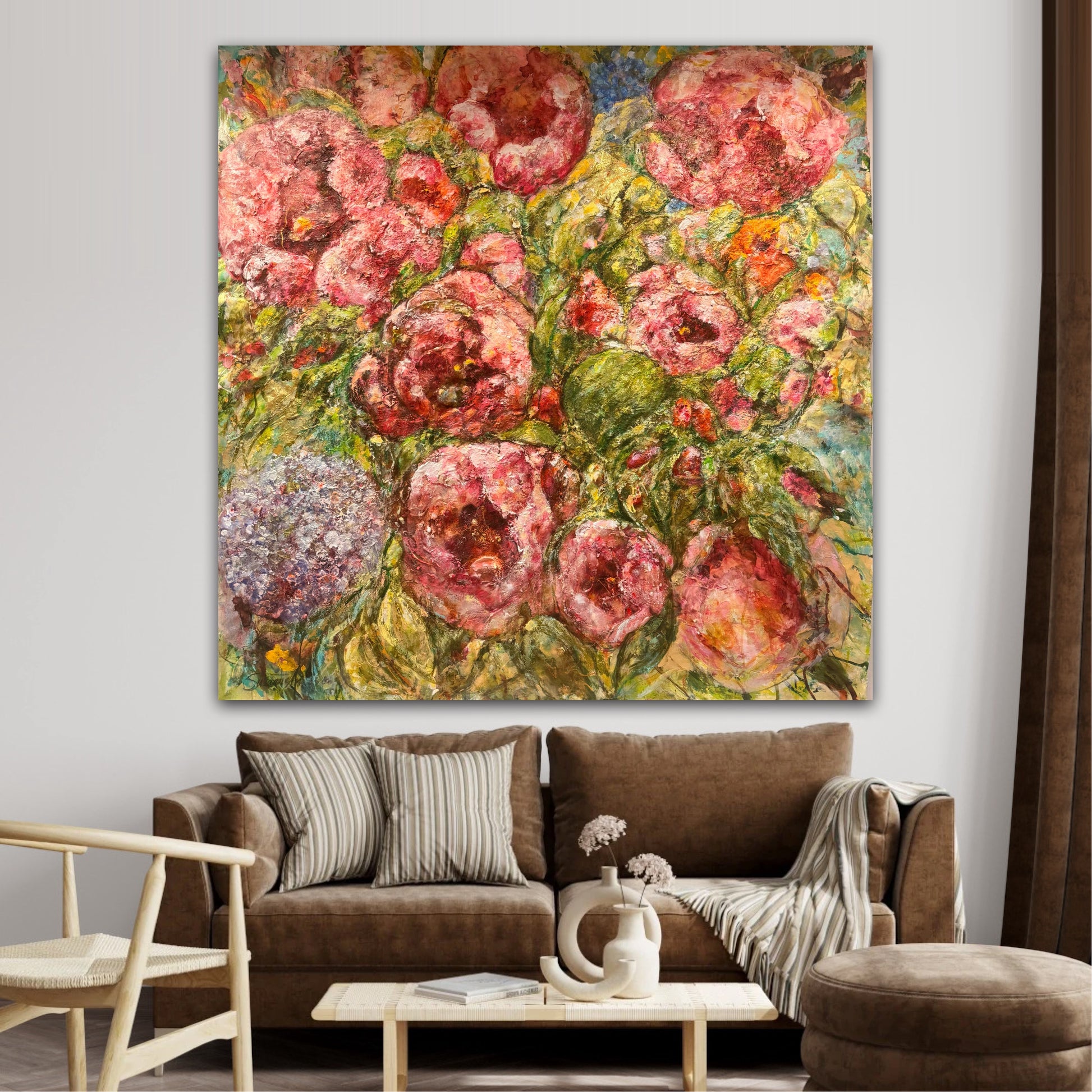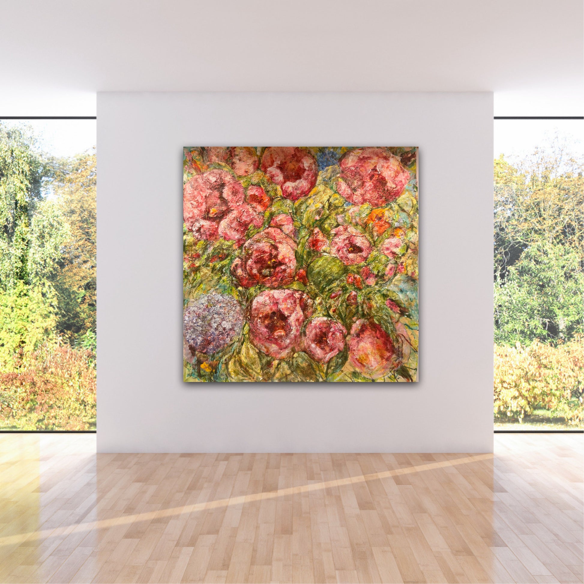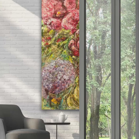 Denna tavlan är en riktigt välarbetad målning, jag har hållit på med den under en mycket lång tid innan jag kände mig helt nöjd. Nu känner jag att den blir ett fantastiskt blickfång i ett hem eller på en oofentlig plats, typ ett kontor. Det är otroligt mycket färger i den vilket gör att den passar in i stort sett alla miljöer, från vitt och mer avskalat men där man önskar få något som drar blickarna till sig. Men, även i en miljö med mycket färger så fungerar nog denna målningen perfekt. Jag älskar själv dessa stora målningar på äkta fin linneduk med råkanten synlig. Jag har en sådan tavla själv över min säng istället för sänggavel.
