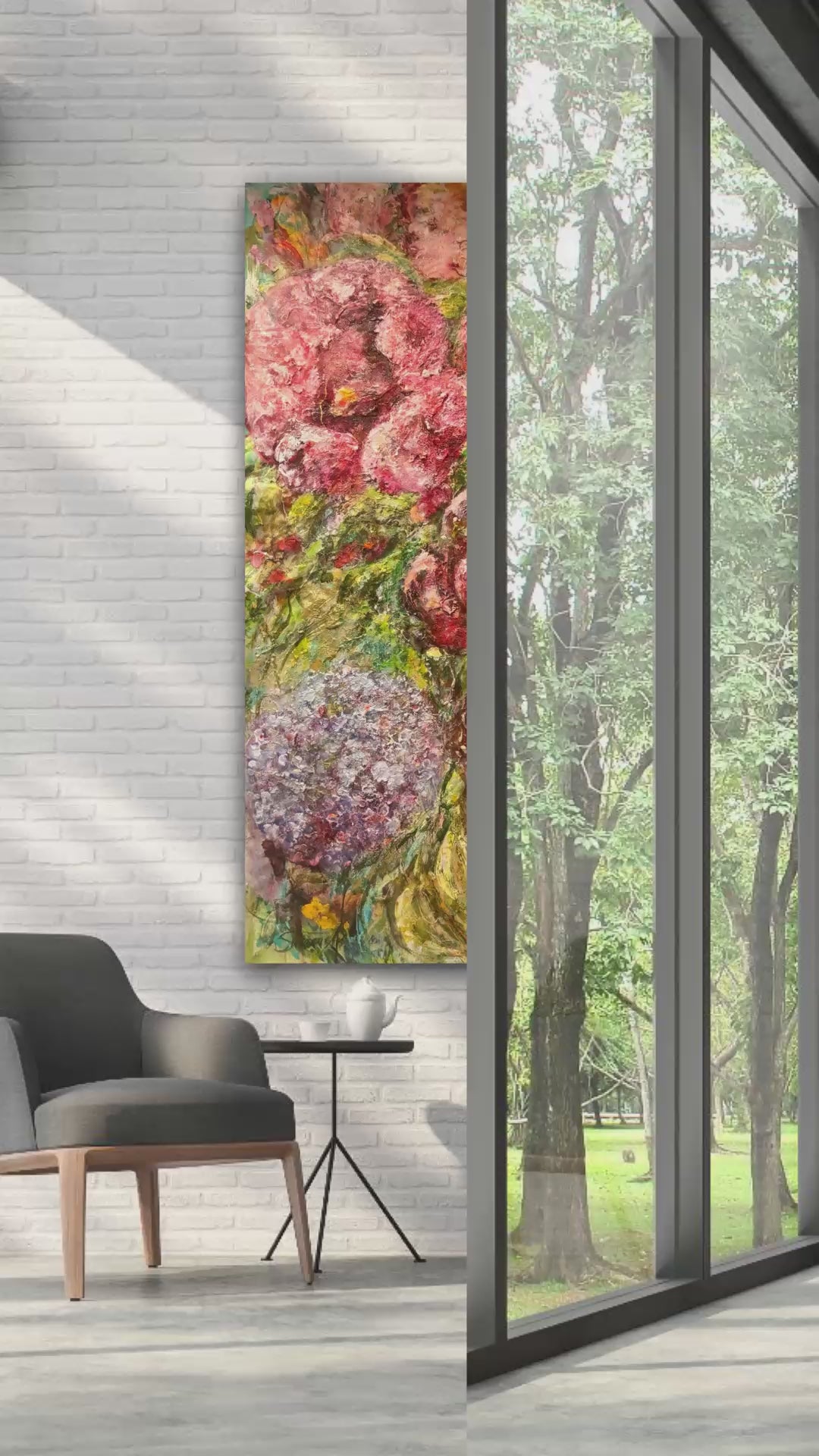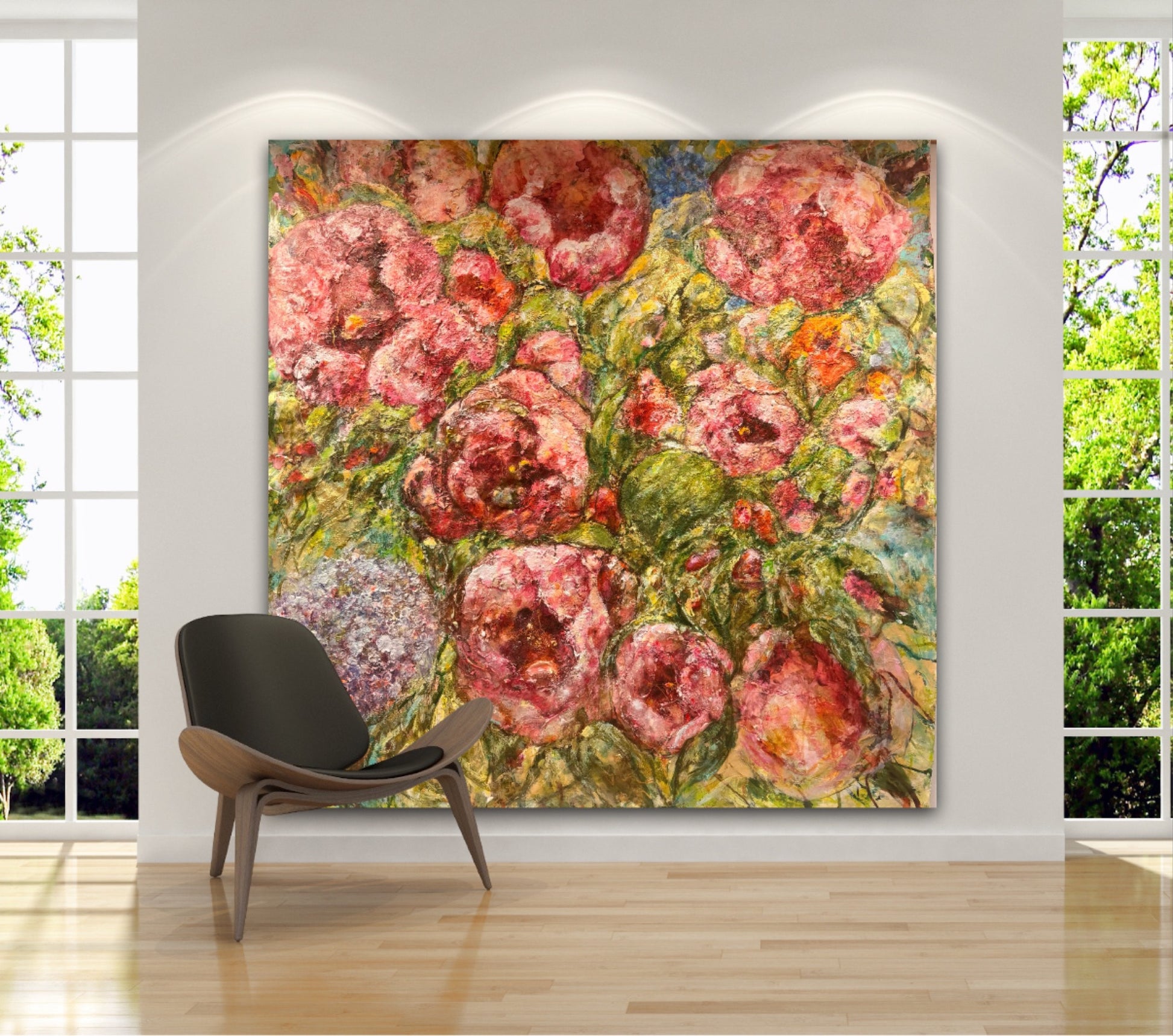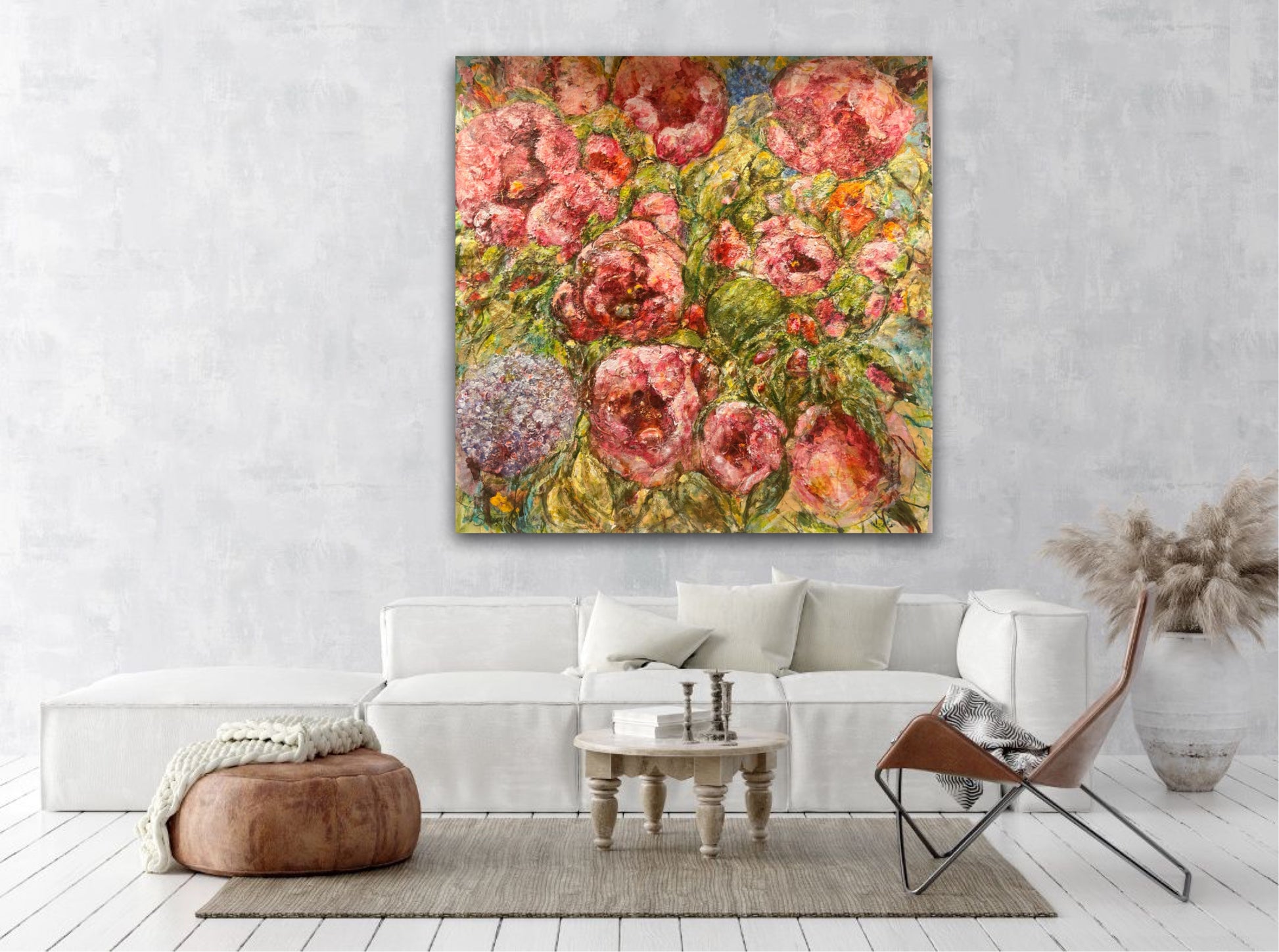 Denna tavlan är en riktigt välarbetad målning, jag har hållit på med den under en mycket lång tid innan jag kände mig helt nöjd. Nu känner jag att den blir ett fantastiskt blickfång i ett hem eller på en oofentlig plats, typ ett kontor. Det är otroligt mycket färger i den vilket gör att den passar in i stort sett alla miljöer, från vitt och mer avskalat men där man önskar få något som drar blickarna till sig. Men, även i en miljö med mycket färger så fungerar nog denna målningen perfekt. Jag älskar själv dessa stora målningar på äkta fin linneduk med råkanten synlig. Jag har en sådan tavla själv över min säng istället för sänggavel.