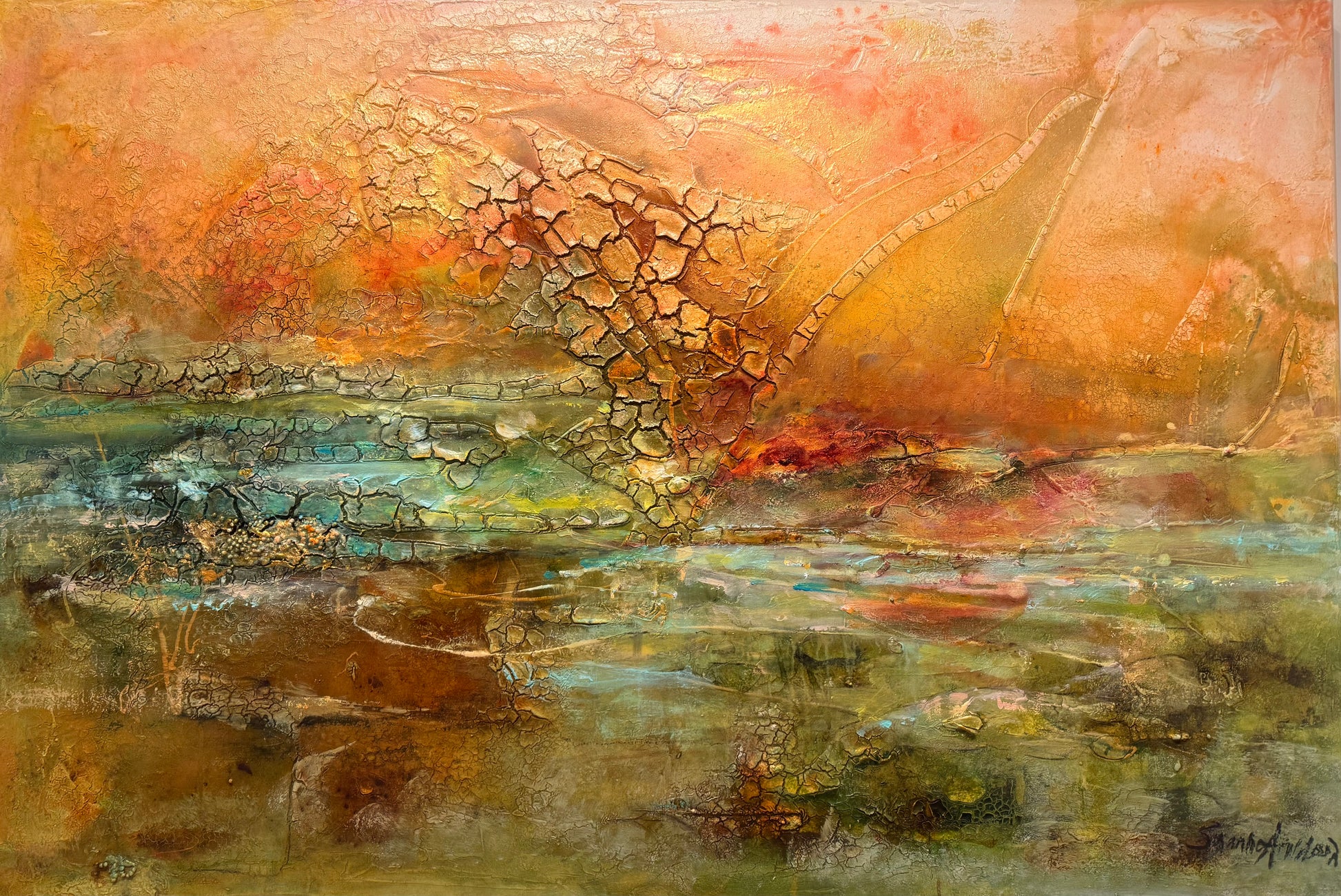 Glödande Horisont är en originalmålning i stort format där varma toner av koppar, aprikos och rost möter djupare jordiga nyanser och mjuka turkosa stråk. Ytan är levande och full av struktur – med sprickbildningar och lager som skapar ett uttryck som känns både kraftfullt och harmoniskt på samma gång.