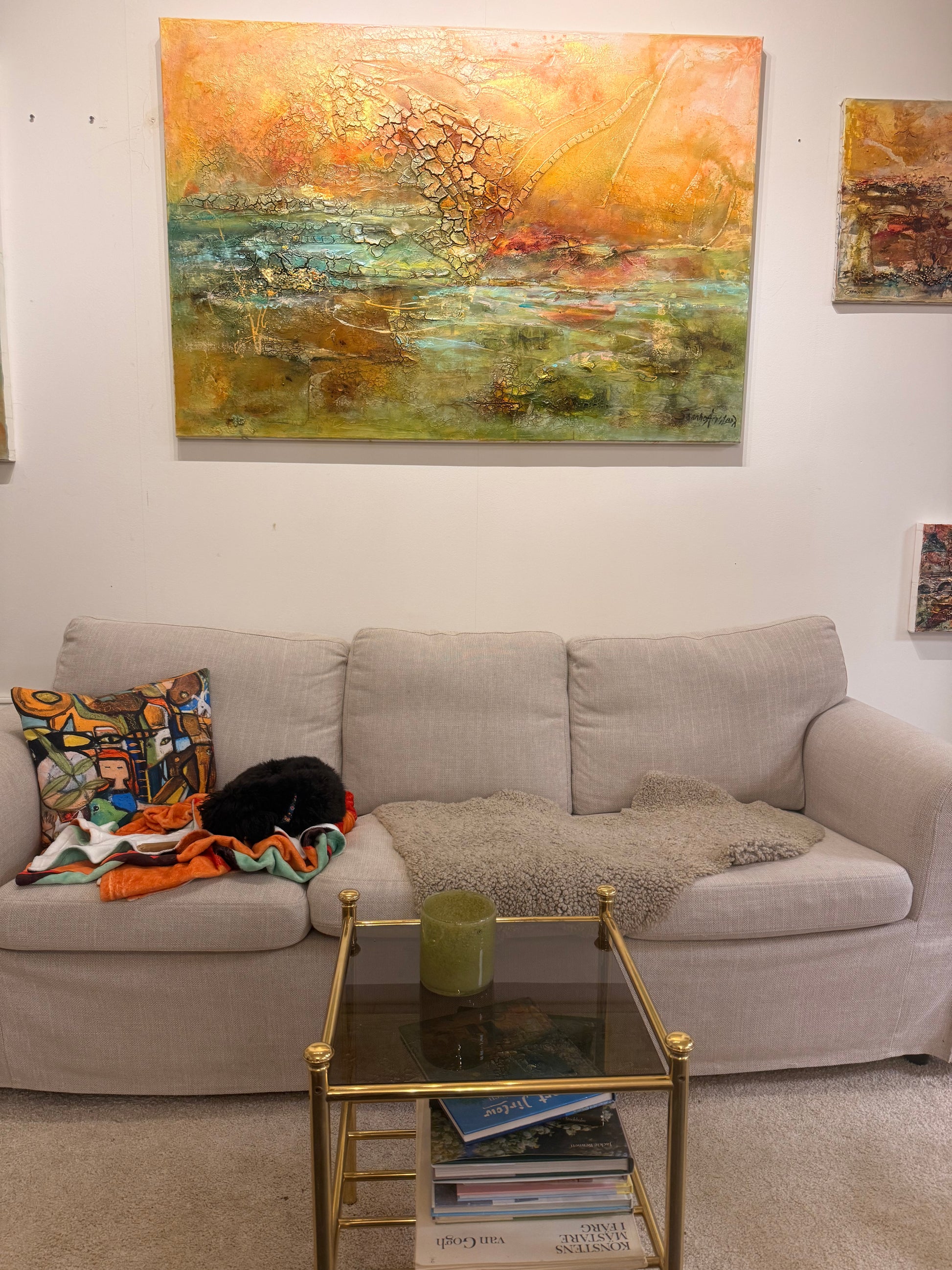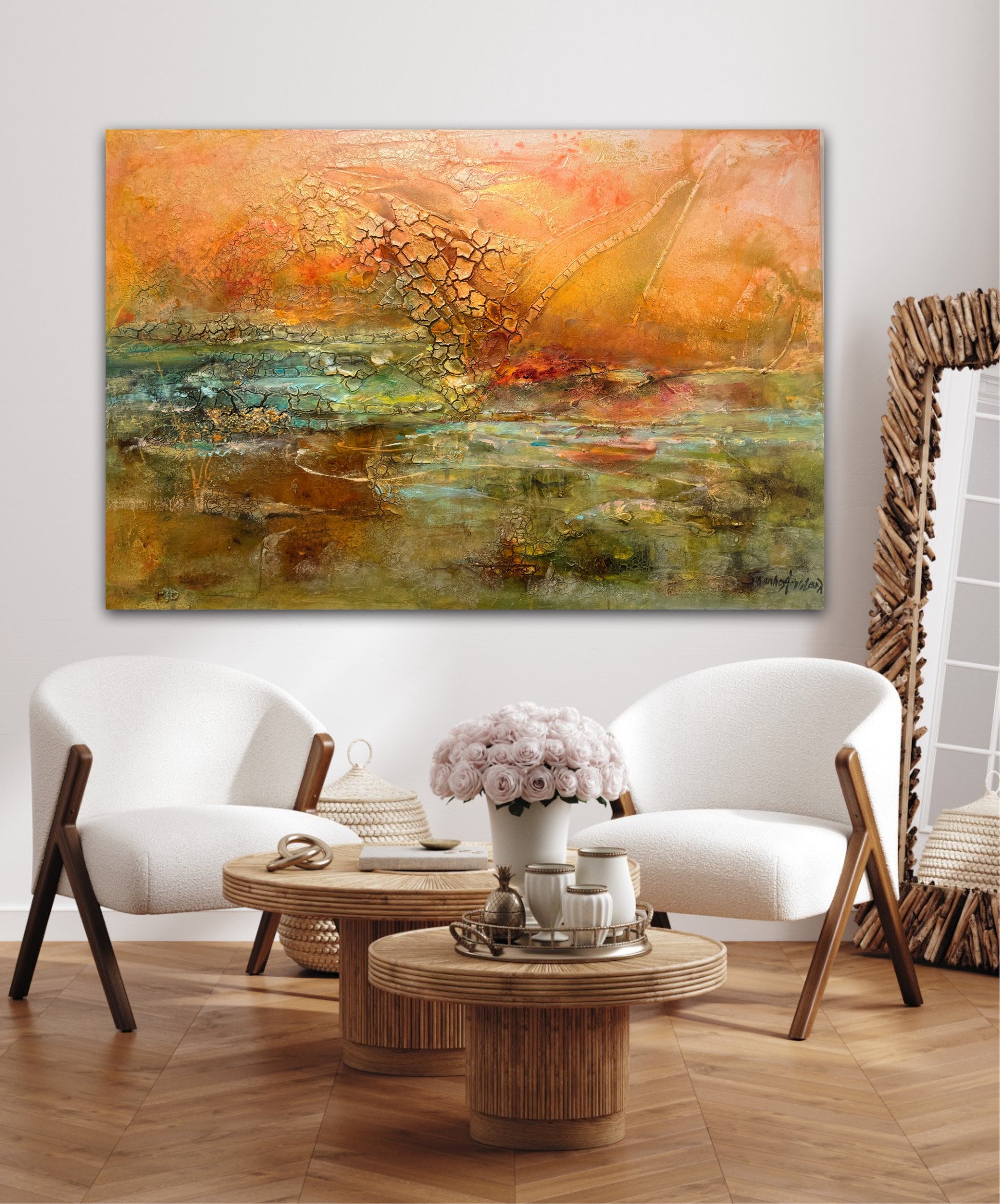 Det här är en målning som tar plats i rummet och ger en varm, exklusiv känsla. Perfekt över en soffa, en säng eller på en stor vägg där du vill ha ett konstverk som verkligen drar blickarna till sig – och samtidigt känns lugnande att leva med.